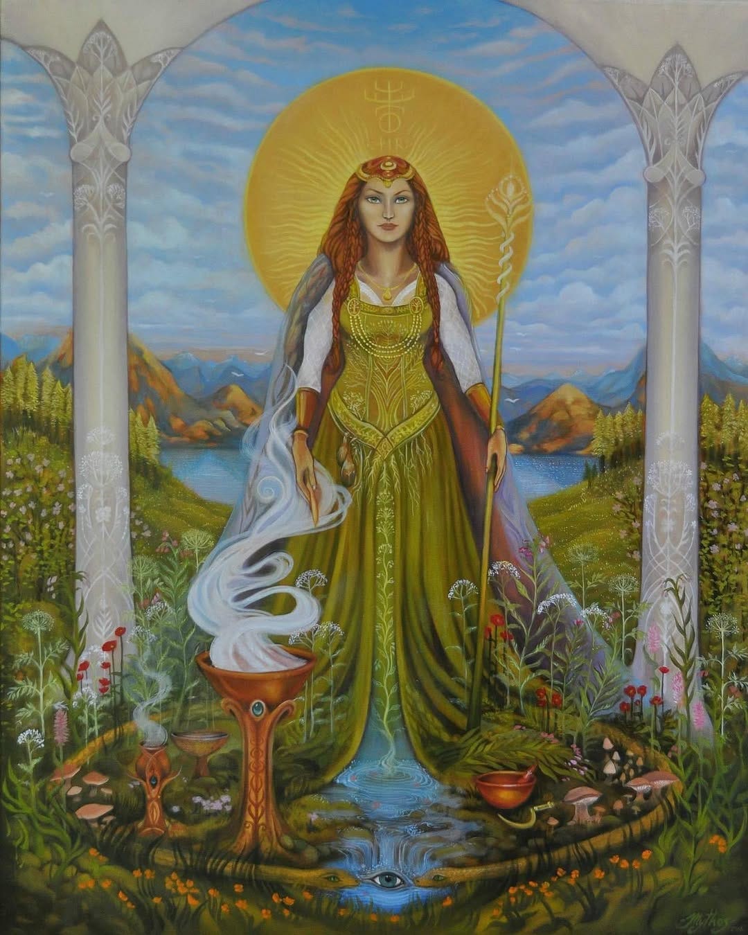 Recently the Norse goddess Eir has felt really alive for me, especially in the mountain air brushing up against the edge of life and death. In Norse mythology Eir represents the medicine woman, the wounded healer who guides the wounded, healer of the living, mediator between life and death. She’s that precise calm restorative force that is present in times of crisis or emergency. Her name means Mercy and Healing, and she is revered for her deep compassion and mastery of the healing arts. Known as the chief physician and herbalist of the gods, she dwells upon the mountain of Lyfia — a place of magical restoration. She offers both physical and spiritual healing, tending body and soul alike, and is the matron of healers, midwives, and all who serve in sacred care. The herbs sacred to her —comfrey, angelica, yarrow, and bistort growin her medicine garden.