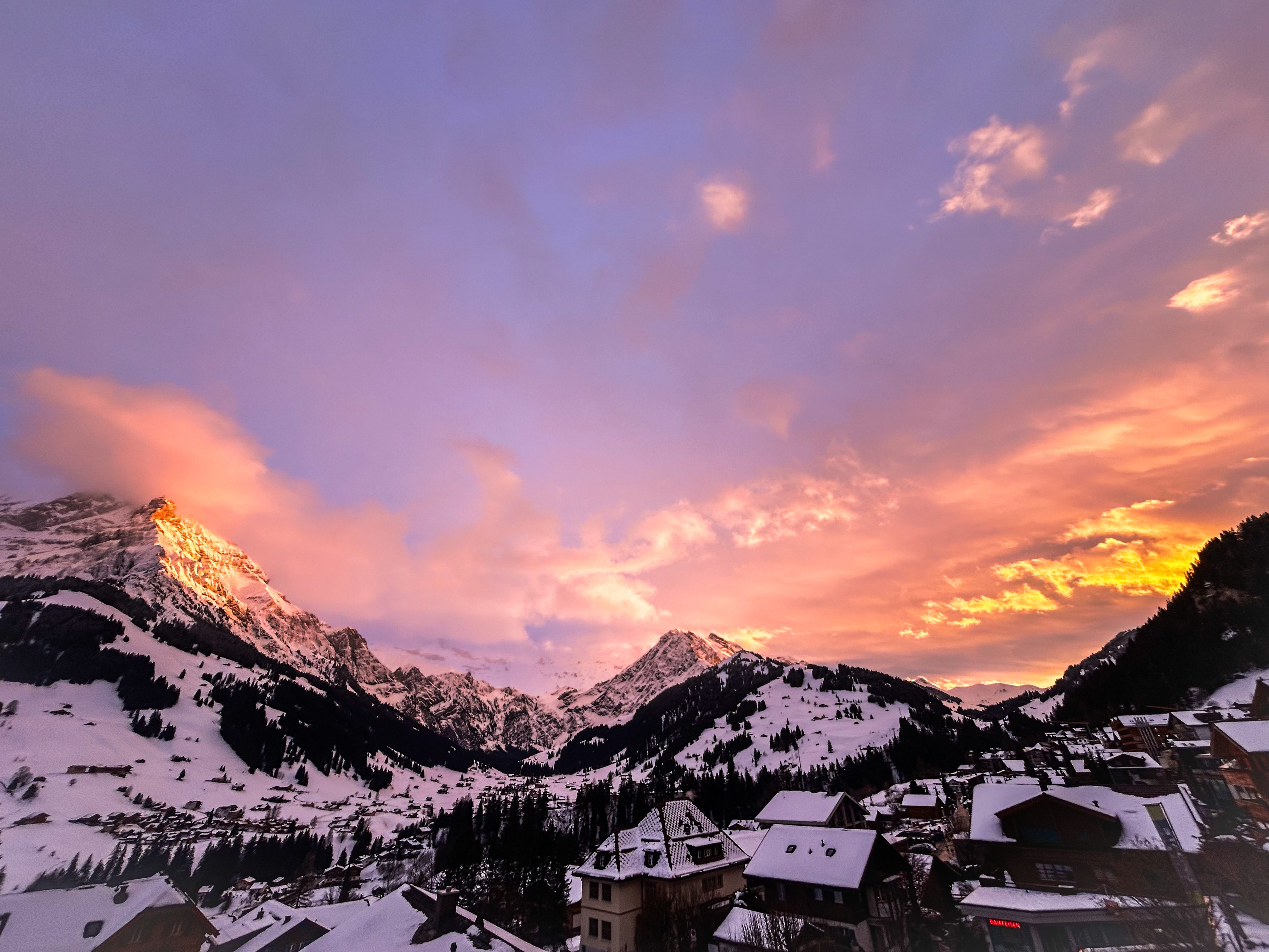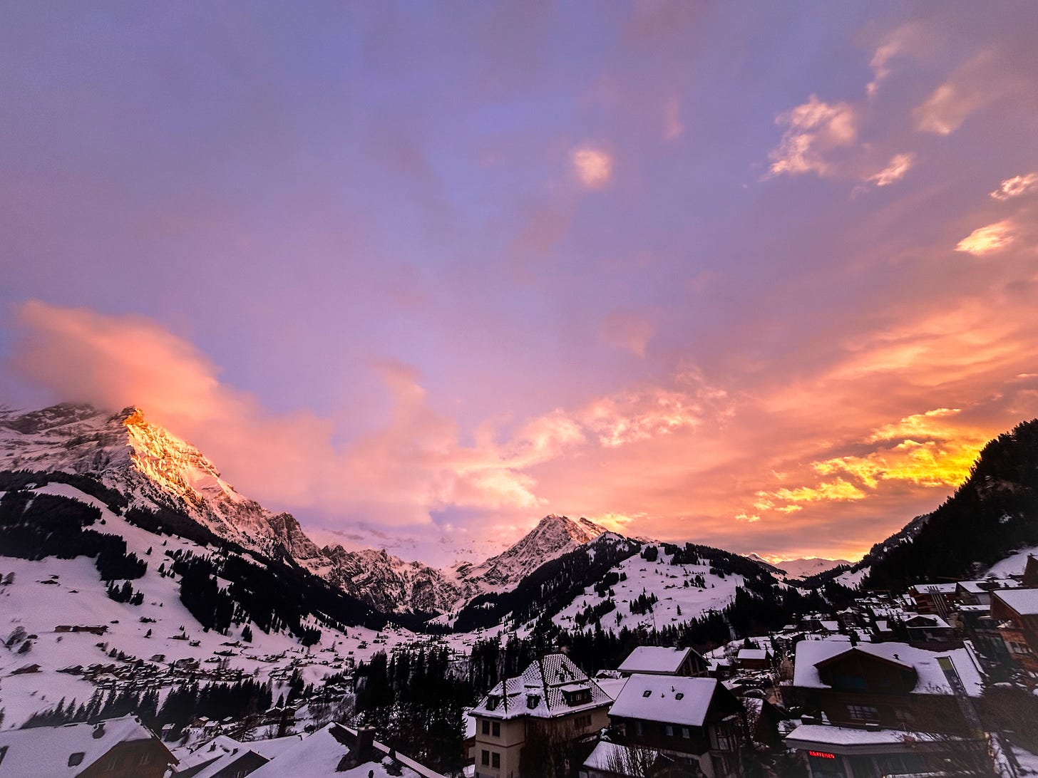 At the crest of the alpine mountain, I felt myself dancing with Eir’s spirit — the air thin, the world hushed, life and death brushing close like mist against the skin. When we descended into the small village of Adelboden, Switzerland, the sun broke through after five days of snow and white silence. It poured gold light across the peaks, illuminating the heavens so brilliantly that the church bells in the heart of the village began to ring, as if the sky itself were rejoicing. I was sitting at my desk when I caught light of the tremendous sunset, and shrieked like a drill sergeant, “Get outside now!” as if this moment was the most crucial phenomenon to witness.